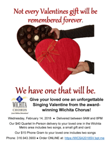 On Wednesday, 2/14/18 - Wichita Chorus quartets deliver Singing Valentines to your special someone and make Singing Valentine Phone Gram deliveries.