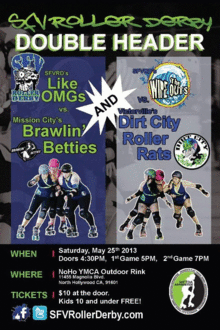 On May 25th, 2013 come see your Wipe Outs take on Dirt City at 5pm. Then stay to watch the Like OMGs, SFVRD all-star travel team, take on Mission City's Brawlin' Betties at 7pm.