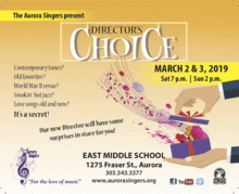 The holidays may seem a long way past in March, so Aurora Singers is offering a gift that is guaranteed to please. Directors Choice will be brought to you in a melodious box with a bow to be unwrapped when the curtain rises. Will it be an eclectic mix of contemporary tunes and old favorites? Or a World War II revue? Will the show be smokin hot jazz? Or will it be a beautiful olio of love songs throughout the ages? Only time will tell like all gifts, its a secret. But we can tell you this: there will be a little dancing, a little humor and a whole lot of singing. Aurora Singers will lavish upon you our love of music wrapped in joyful exuberance.